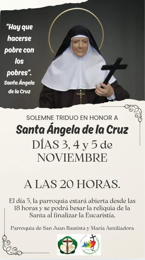 Durante los días 3, 4 y 5 de Noviembre, tendrá lugar el triduo a nuestra tercera titular. Todos los días a las 20 horas en nuestra Parroquia de San Juan Bautista y María Auxiliadora.
